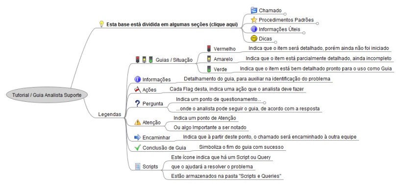 O mapa abaixo criei como guia de atendimento de chamados e solução rápida para os analistas de suporte N2 de um time que atuei. Semelhante a um fluxo de processo mas muito mais intuitivo e fácil de usar: